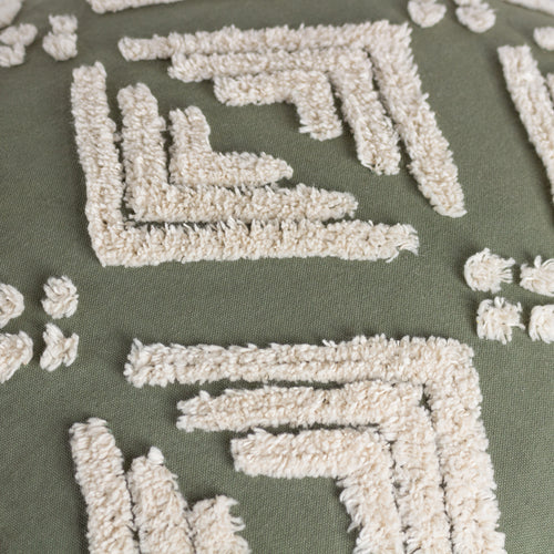 Featuring a bold, eye-catching diamond geometric pattern in rich emerald green set against a soft, neutral cream background, this cushion is a true statement piece. The unique pattern is created using a hand-loomed tufting technique, giving the design a wonderfully plush, three-dimensional texture that's irresistible to touch.